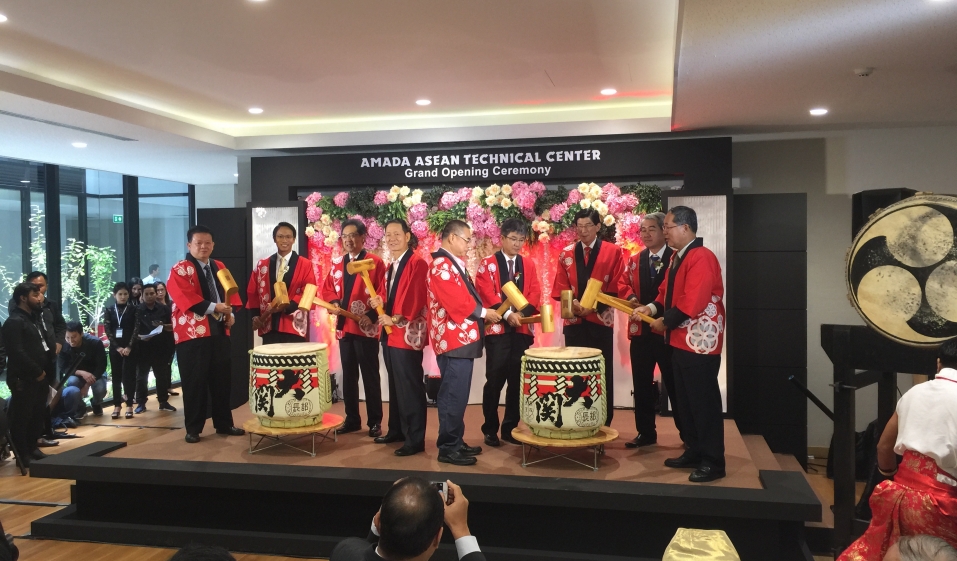 アマダASEANテクニカルセンターの開業記念式典が、2016年8月16日にアジア工業団地スワンナプームにて行われました。 写真は、アマダグループ重役の皆様と式典に招待されたお客様も参加し、新センターの開業を記念した鏡割りを行った際の模様です。 このセンターは、タイやその他ASEAN諸国からの顧客に対し、最新技術のデモンストレーションや教育施設としての活用が見込まれています。